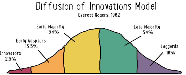 No marketing, há um conceito interessante que estuda o comportamento dos consumidores. Trata-se da teoria da difusão da inovação proposta pelo sociólogo Everett Rogers em seu livro "Diffusion of Innovations" (1962), que descreve como as inovações (produtos ou tecnologias) se espalham entre a população ao longo do tempo. Ela divide os consumidores em diferentes grupos com base em sua disposição para adotar novas tecnologias ou produtos. Esses grupos são:
